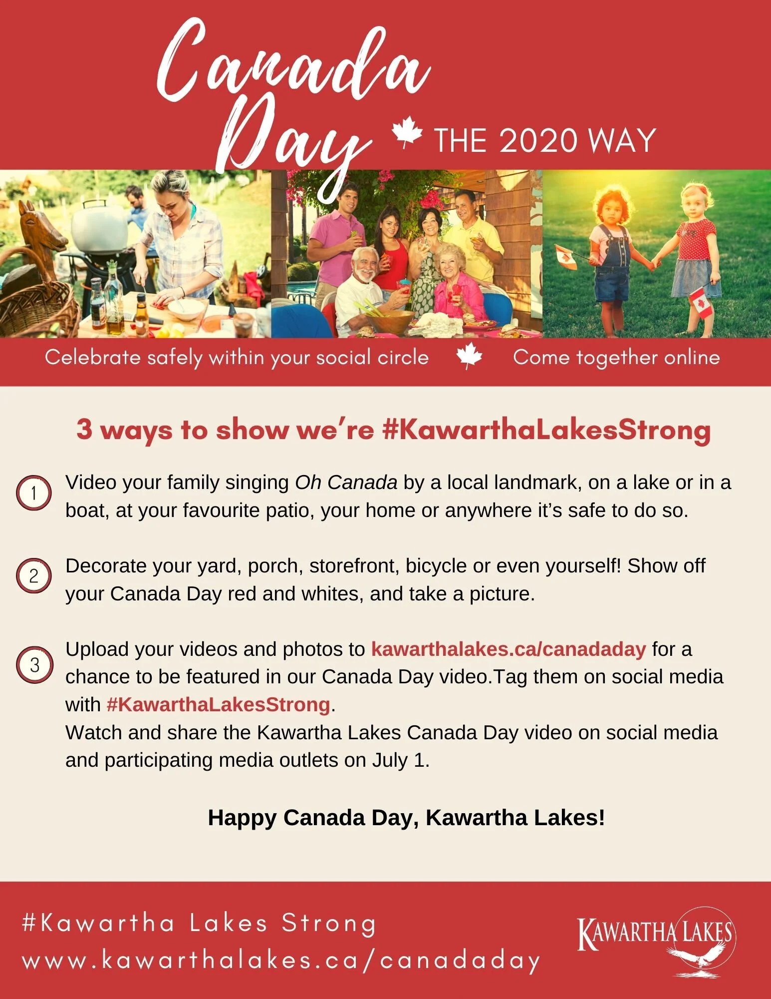 To upload your photos and videos, please visit Kawartha Lakes Canada Day. The video will be posted on the City of Kawartha Lakes’ channels and participating media outlets on July 1, so you can watch and share it on Canada Day.