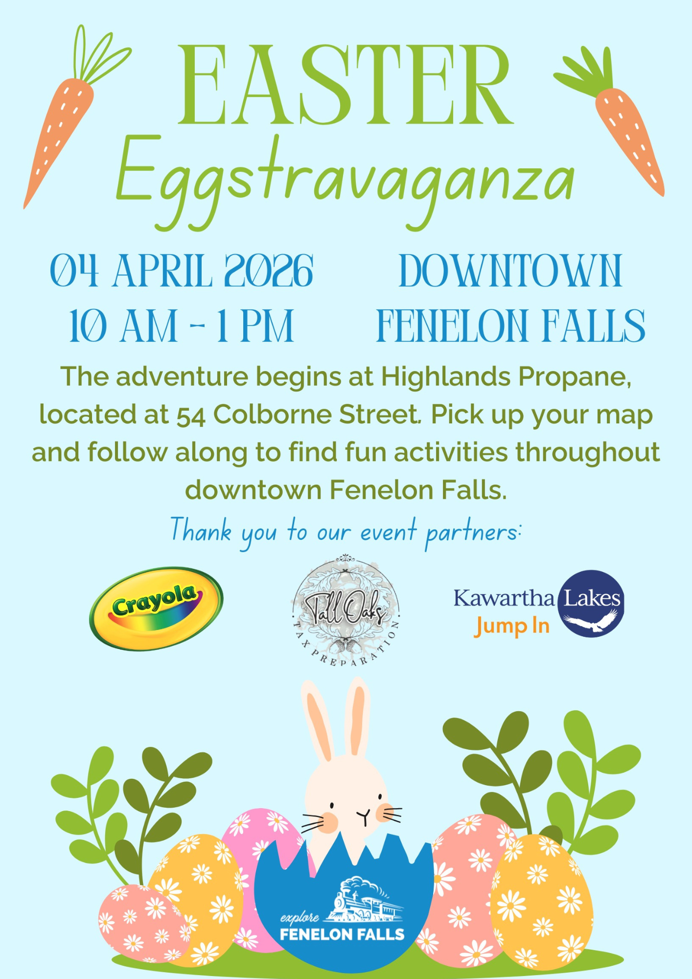 Thank you to our great partners for helping make Easter Eggstravaganza possible: the City of Kawartha Lakes, Tall Oaks Tax Preparation, Crayola, the Fenelon Falls & District Chamber of Commerce, participating businesses, community volunteers and the event committee.