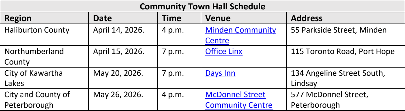 Please note that the Community Town Halls will also be taking place in Alderville First Nation, Curve Lake First Nation and Hiawatha First Nation along with an Urban Indigenous virtual session - more information will be shared directly through communities.