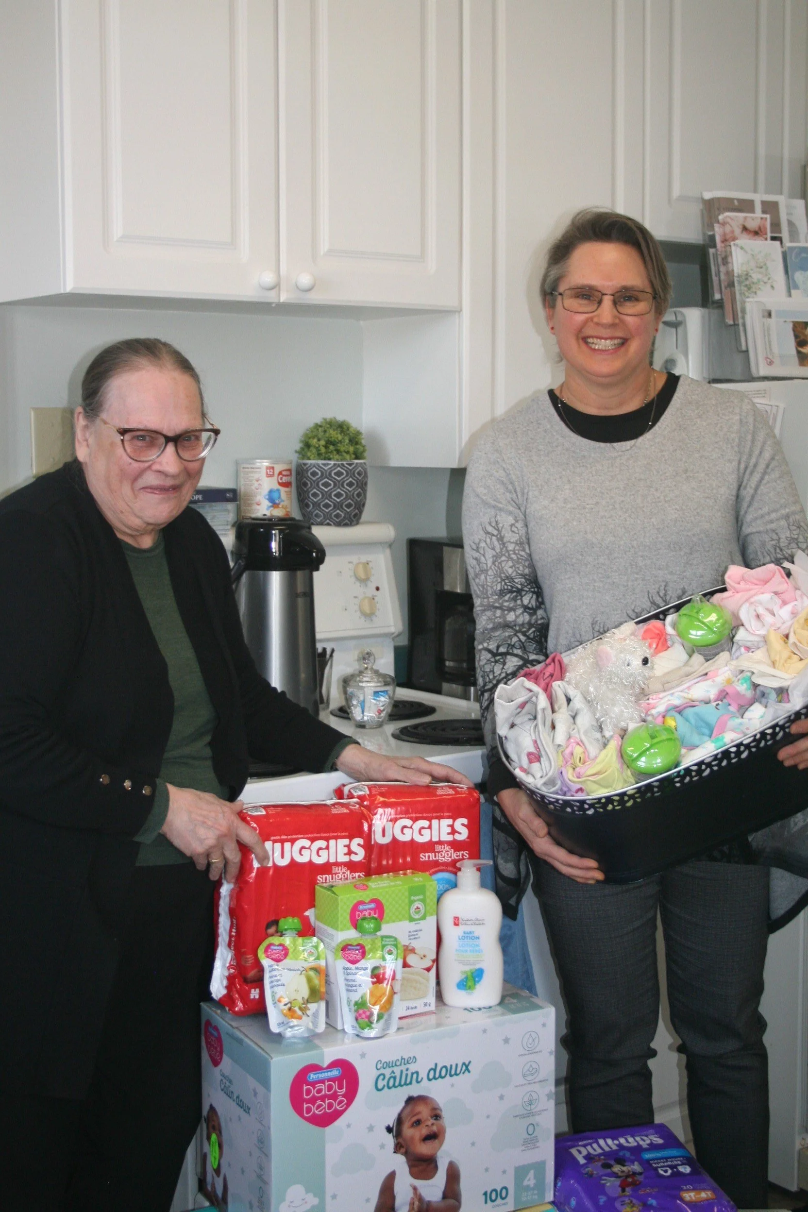 Sue Smith, Administrative Assistant and Michelle Botting, Executive Director, Kawartha Lakes Pregnancy Centre with baby items donated by members of Soroptimist International of Kawartha Lakes