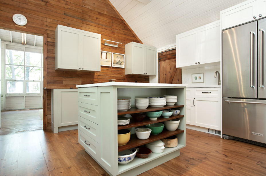 Open shelving allows for the clien’ts dish collection to be displayed and at the same time adds variation to the island.