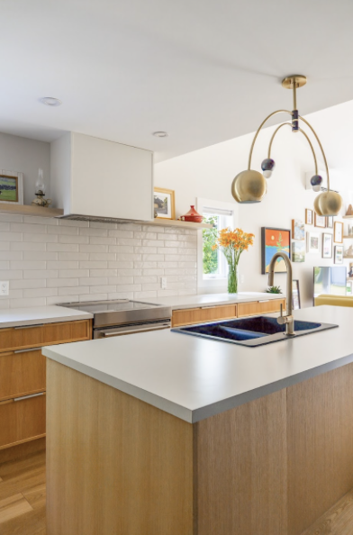 An example of how we used multiple finishes and colour to still unify this kitchen. Using the wood on the island allows it to standalone and the single light fixture treats it as if it’s a table vs using pendants.