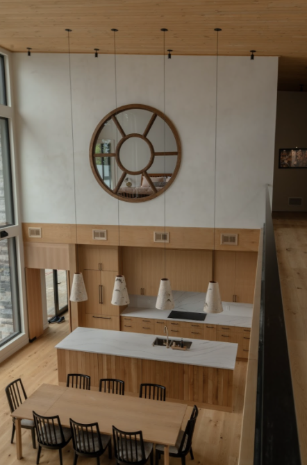 Custom birch wrapped pendants in this Balsam Lake build, add cottage character and at the same time are unique to this kitchen island adding connection to the ceiling and drawing the eye up to the second- floor interior window treatment.